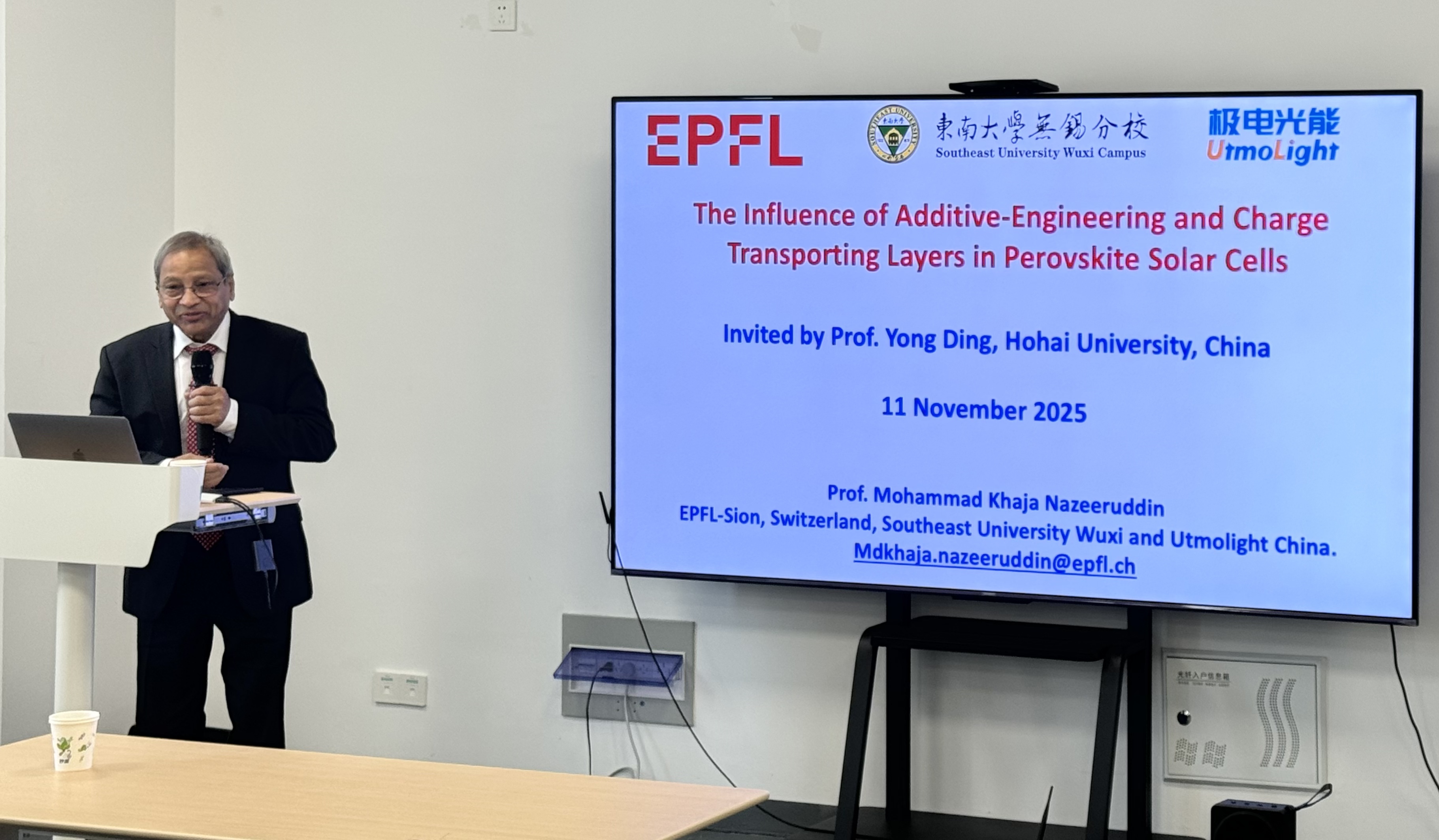 2025年11月11日,应我校Bwin官网邀请,国际杰出科学家、瑞士洛桑联邦理工学院(EPFL)Prof. Md. K. Nazeeruddin教授莅临我校,作题为“Perovskite Solar Cells: A new Paradigm in Energy Sector”(钙钛矿太阳能电池:能源领域的新范式)的专题学术报告。报告在Bwin官网会议室举行,由Bwin官网丁勇教授主持。吸引了来自光伏、风电、材料等多个专业的师生参加,现场座无虚席,气氛热烈。